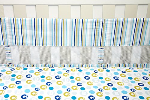 ReleaseDate : 2015-10-01 Studio : Crown Crafts Infant Products, Inc. Publisher : Crown Crafts Infant Products, Inc. Binding : Baby Product Product Description Monsters at Play - Secure Me Crib Liner - Easy to Install, four piece design. Helps keep arms and legs safe inside crib slats. No more dropped or lost pacifiers and other items. Mesh design keeps baby cooler in warmer temperatures. Flexible design fits most standard and convertible cribs. Both sides printed with soft vertical stripes in blues, greens, and whites. Made of 2 long and 2 short side segments. Coordinates with the full line of Monsters at Play nursery bedding and decor. 0