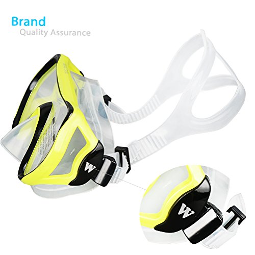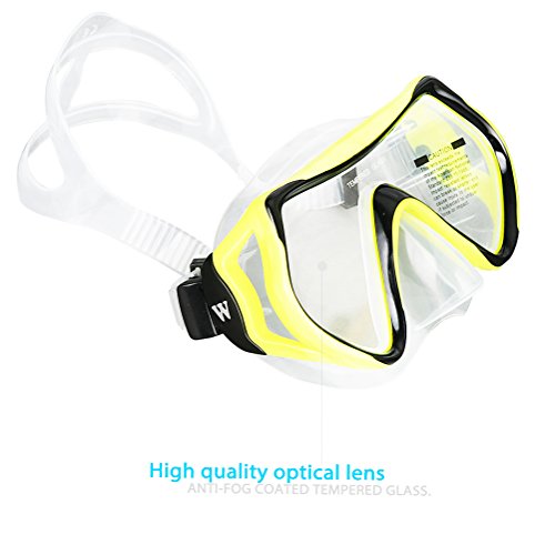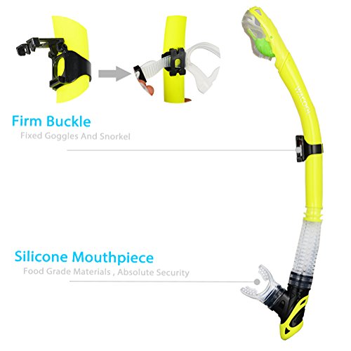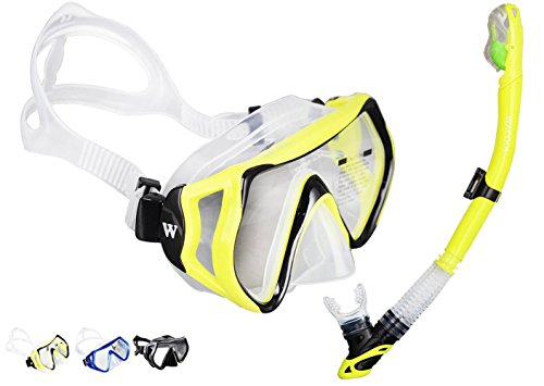 WACOOL Snorkeling Package Set for Adults, Anti-Fog Coated Glass Diving Mask, Snorkel with Silicon Mouth Piece,Purge Valve and Anti-Splash Guard,.(Yellow-Black)
