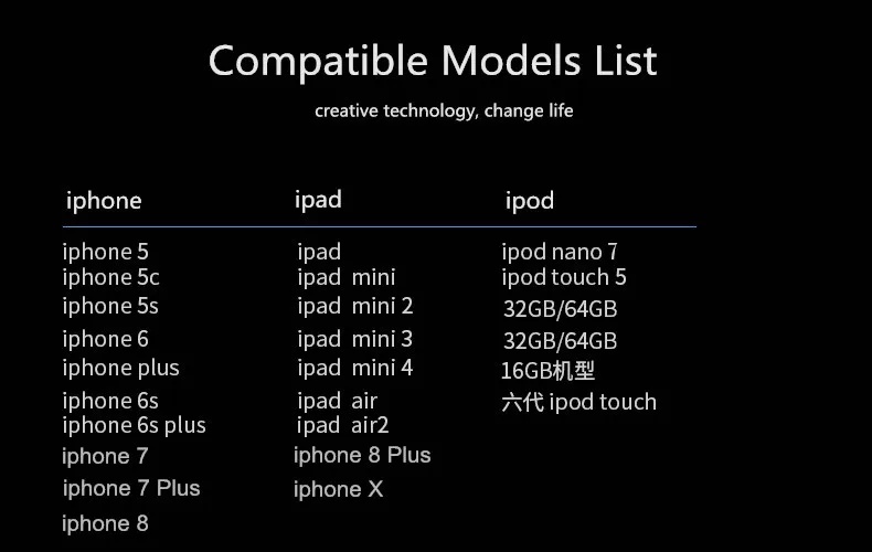 Compatiable model:For Apple iphone X 7 7 6S 6 Plus 5 5S SE ipad mini 3 4 Air 2 ipod