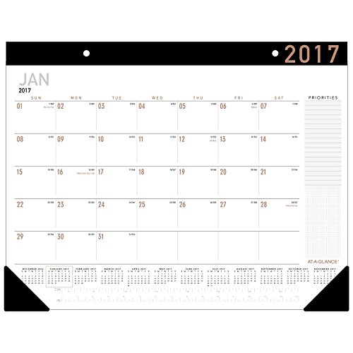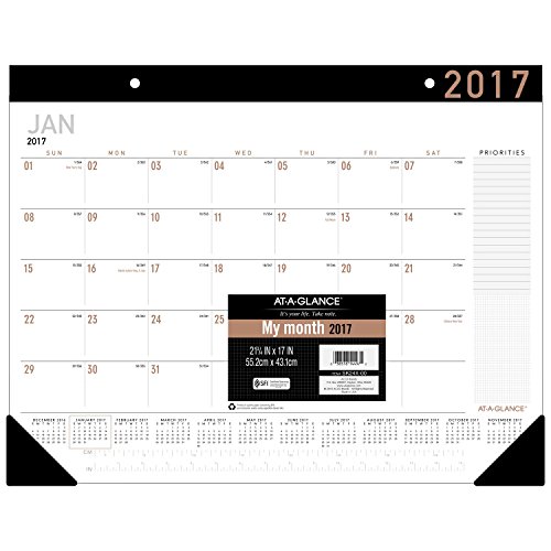 -. Binding : Office Product -. Brand : At-A-Glance -. EAN : 0038576144972 -. Feature : Contemporary desk pad features a fashion-forward color scheme and design elements. Monthly protection for your desktop with a full 12 months of planning from January - December.** / One month per page with unruled daily blocks to write in notes and reminders on each date. Extra writing space for P.R.Iorities also included.** / Full year calendar reference on each monthly calendar page makes it easy to quickly look up dates. 15 inch ruler on every page for convenience.** -. Label : ACCO Brands -. Manufacturer : ACCO Brands -. Model : SK24X00 -. MPN : SK24X00 -. NumberOfItems : 1 -. PackageQuantity : 1 -. PartNumber : SK24X00 -. ProductGroup : Office Product -. ProductTypeName : OFFICE_PRODUCTS -. Publisher : ACCO Brands -. Studio : ACCO Brands -. Title : AT-A-GLANCE Desk Pad Calendar 2017, Monthly, 21-3/4 x 17" (SK24X00) -. UPC : 038576144972