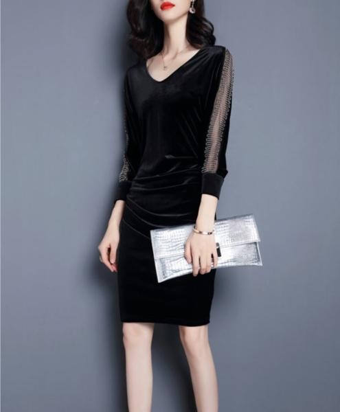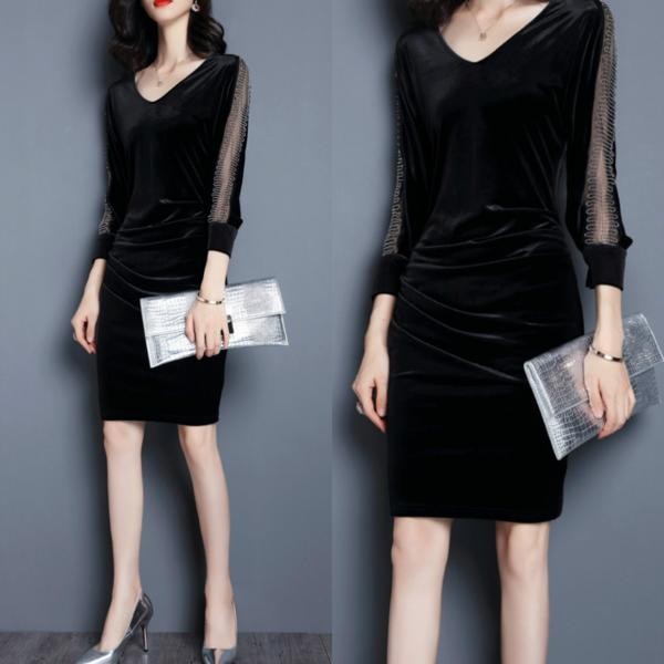 ベルベット 長袖シースルー 膝丈 タイトワンピース