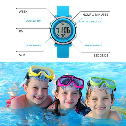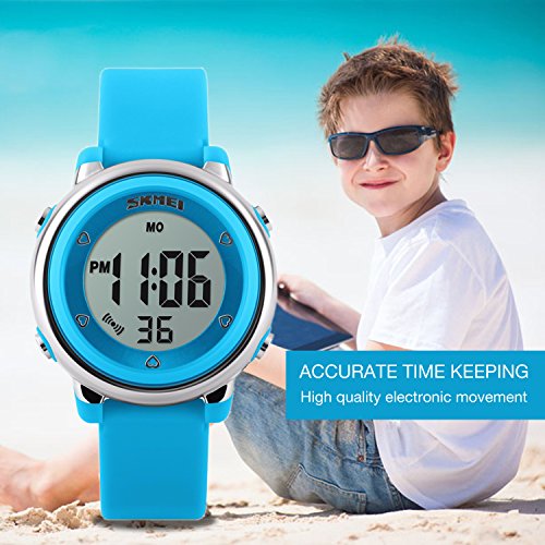-. Feature : Digital WATCH: Fashionable sporty dial design for kids, sport style outlook. Large Dial and numbers with light, show time clear in the dark. Use import EL Lamp, Press "LIGHT" button to see the time clearly in the light.Digital WATCH: Fashionable sport dial design for kids, sport style outlook. Large Dial and numbers with light, show time clear in the dark. Use import EL Lamp, Press "LIGHT" button to see the time clearly in the light. / PRECISE TIME KEEPING: Original Movement, provide precise and accurate time keeping for kids. Imported battery which can provide the sport watch strong power. Watch time is super easy to read with high transparency resin wristwatch face and clear digital dial. / HIGHLY TRANSPARENT RESIN GLASS: The watch glass is made from the highly clear resin material imported abroad and sealed with the case by high frequency machine. So that the glass is extremely hard and pressure-tolerant.HIGHLY TRANSPARENT RESIN GLASS: The digital watch glass is made from the highly clear resin material imported abroad and sealed with the case by high frequency machine. So that the glass is extremely hard and pressure-tolerant for hyperactive kids( girls or boys). / WATERPROOF FOR DAILY USE: 50M Water Resistant, HANDWASH, SWIMMING, NO PROBLEM ! Feel free to wear the digital sport stopwatch when kids are showering, swimming and diving. NOTE: Please DO NOT press any buttons in the water or wear this wristwatch for longtime underwater activities / COMFORT: High quality silicone bandstrap, plus spray handle oil, the strap is soft and comfortable and environmental friendly for kids. This blue digital LED electrical luminescent waterproof watch is very suitable for girls or boys outdoor play.