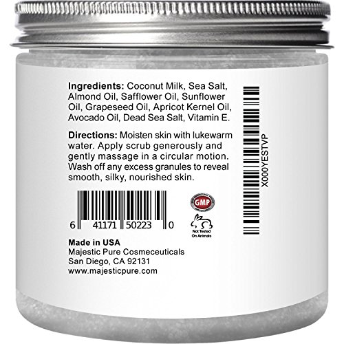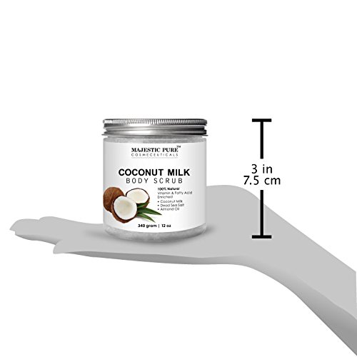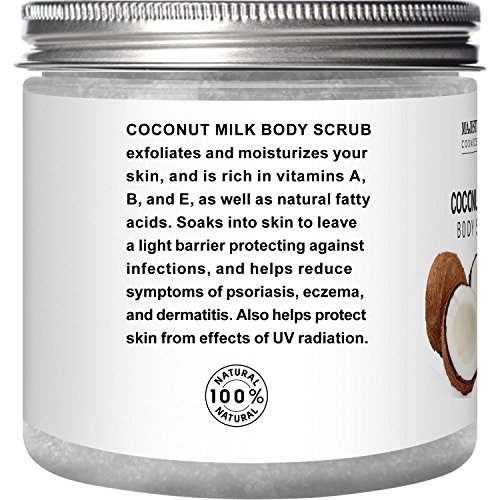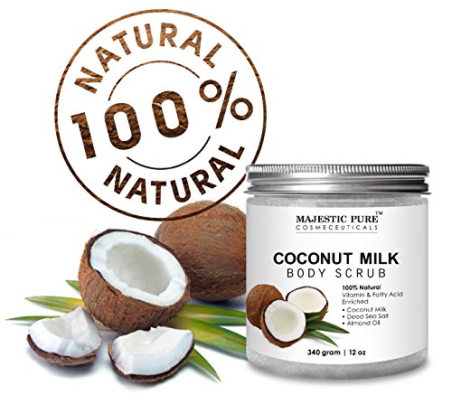 Majestic Pure Coconut Milk Body Scrub is 100% natural and specifically formulated to promote healthy looking skin and complexion; great cellulite remover; effective eczema body wash; natural skin care for stretch marks; manufactured in USA in GMP lab.
