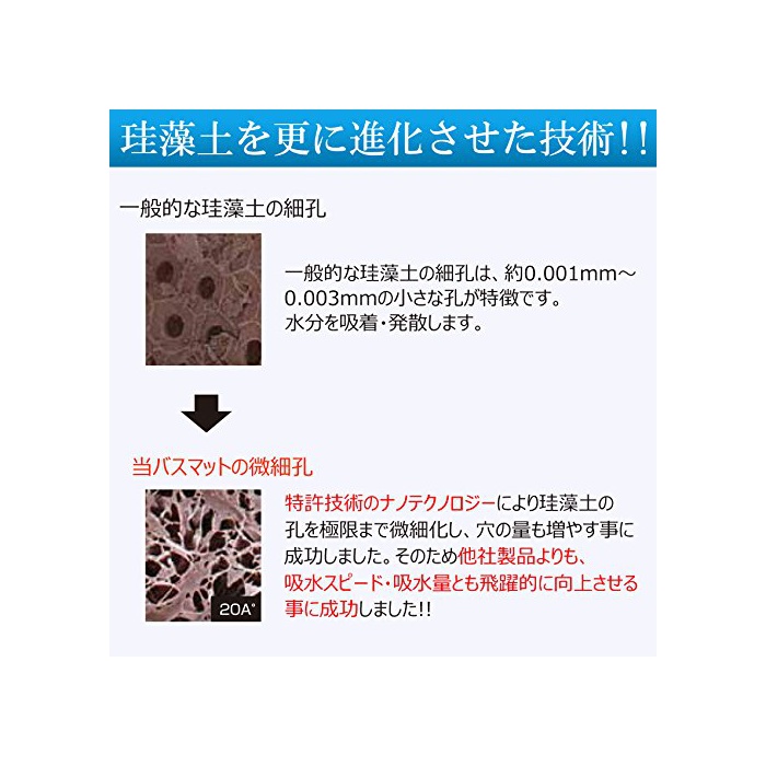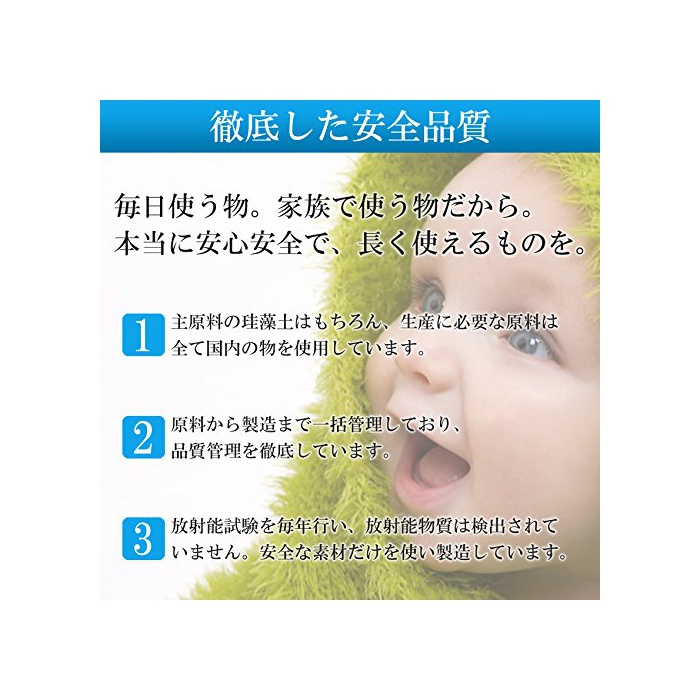 【7개의 독자 기술】(1)외국의 원료는 일절 사용 하지 않고,모두 국산 원료입니다.안심에 길게 사용할 수 있는 바와 같이(하도록) 제조 하고 있습니다. (2)방사능 시험을 매년 하고 있고, 방사성 물질이 검출 되어 있지 않은 안전 품질입니다.외국제와 같은 싫은 냄새도 없습니다. (3)특허 기술에 의해 규조토를 거듭 진화시키고, 흡수 스피드&흡수량과도(모두) No.1에! (4)당사 제품은,특허 기술에 의해 냄새나 유독가스를「흡착→분해→무취 무해화」하기 위하여,냄새나 유독가스를 재방출하는 일 없이,또한 그 능력도 영구적으로 지속합니다(특허 신청 중).(일반적인 규조토는 유독가스나 냄새를 흡착하지만 분해할 수 없는 모아 두고, 포화 상태가 되어 악취를 방출합니다.) (5)특허 제법 하고 있는 당사 제품으로는「곰팡이 다《니》무좀균의 번식 없음」이라고 하는 곰팡이균 테스트 결과를 얻어 있습니다. (6)1.8kg의 경량 타입에 운반도 편안하게.내구 중량은 200kg에 내구성 발군입니다.특수 제법을 하고 있기 때문에,표면의 차가움도 느끼기 어려워 되고 있고, 마루에 두어도 젖음(정사/연애/호색)족으로 타고도 미끄러지기 어려운 설계입니다. (7)세계 최대의 국제 전시회(nano tech 2008 국제 나노 테크놀로지 기술 회의)나오고, 당제품의 소재가 대상을 수상.