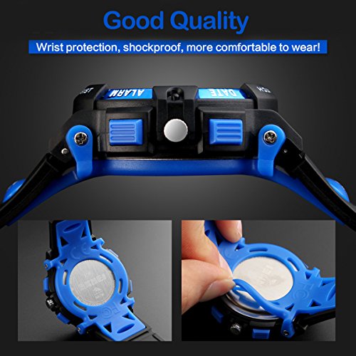 -. Feature : Sport Fashion Design: This is a multi-functional child watch, As a gift to the children's best choice. / Multifunctional Sport Watch: Alarm clock,Stopwatch, LED Back light; Calendar ;12/24 hour format. / Water resistant to 5 ATM, withstands rain and splashes of water, HANDWASH, SWIMMING, Please DO NOT press any buttons in the water or wear this watch for longtime underwater activities / COMFORT: High quality rubber strap, the strap is soft and comfortable and environmental friendly. / THE PACKAGE INCLUDED - Kids Sports Watch x 1,Watch Box x 1