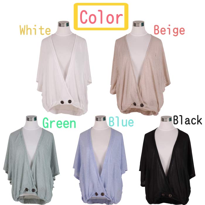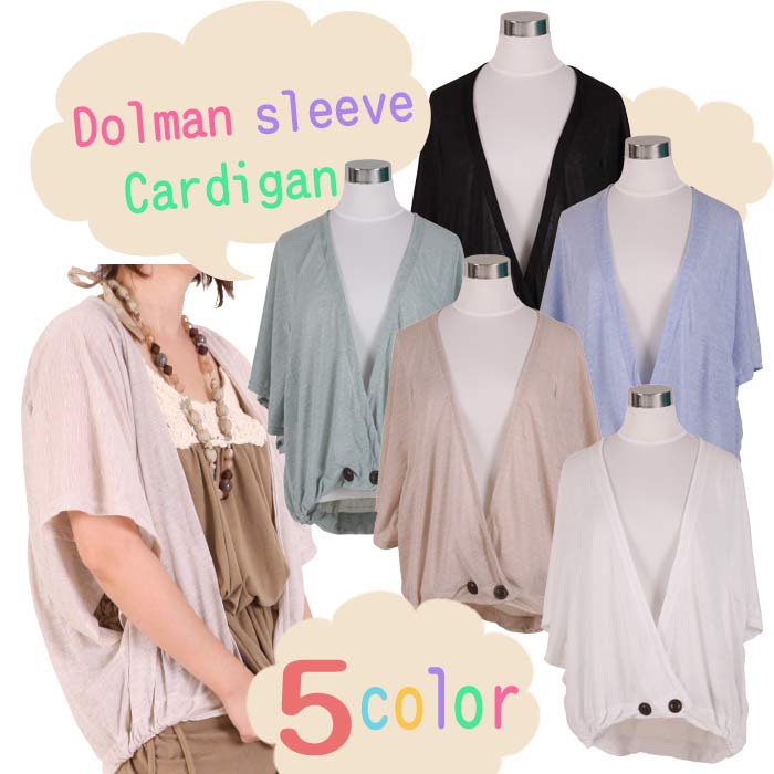 《商品説明》ドルマンスリーブの5分袖カーディガンです。薄手のテロっとした素材でさらっと着ていただけます。カラーも今年らしい淡いキャンディーカラーで揃えました☆《サイズ》バスト 約132cm 肩幅  Fcm 裾幅  約43cm 着丈  約60cm《素材》ポリエステル 80%レーヨン   20%