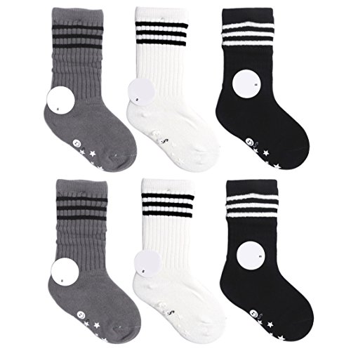 -. Feature : NOTE:ONLY size S(1-3 years) has anti-slip sole, other size none. All pictures show are S(1-3 years);The tube length between different pairs are slightly different / Size: S (1-3 years--anti slip sole), M (4-6 years), L (7-10 years) / High quality material with strong elastic. The socks are always over the calf even to knee, it depends on the length of your baby legs / Fashion three stripes with classical colors (white / black / grey) long socks keep your children warm with a fashionable cute look. Easy to maich. Great for casual daily,photo show,party and perfect gift for birthday,Halloween,Christmas and so on / More kids/toddler/infant socks, pls click "VWU" above. We offer variety of exquisite cute socks. In the VWU store, there is always some socks you need, whether for daily wear or pick a gift, no matter any season
