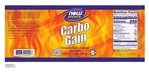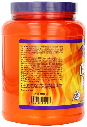 Studio : Now Foods Publisher : Now Foods Binding : Health and Beauty Product Description NOW Carbo Gain is a 100% pure maltodextrin, an easily digestible complex carbohydrate derived from corn. ?Maltodextrin contains glucose polymers , linked sugar compounds that are easier for the body to assimilate and use. ?Glucose polymers are metabolized at a slow, steady rate that can help to sustain energy levels during endurance oriented workouts and/or athletic events and support weight gain. ?Carbo Gain contains virtually no protein, fat or fiber and is a convenient source of energy for active individuals.* ?Look to NOW for all of your high quality sports supplement needs. 0