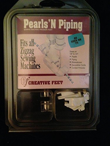 -. Feature : Fits All Sewing machines that have a zigzag stitch. / Sew all sizes of pearls, Piping, Cording, Chain, Wire, Couching, bulky yarns, never hold trims! / Gathering is easy with the Pearls N Piping foot by Creative Feet - Increase tension, lengthen straight stitch, secure the stitch beginning and watch your fabric gather all the way up! / Sew and Couch all round trims on denim, lingerie, bridal, stretch, dance costumes, sew like designers on Project Runway and make money from your sewing! / Fits all sewing machines with a zigzag stitch, sew Pearls, Beads, Rhinestones, piping, zippers, gathering fabric has never been easier! Holds all sizes of beads, pearls, chain, wire, cording, couching trims, rat tail notions in place so you don't have to hold the trims. Warranteed for life from Creative Feet and Guaranteed to fit your zigzag stitch capable sewing machine or you money back! Pearls N Piping has been selling world-wide for over 26 years. Created for a handi-capped sewer with damaged hands. Never have to hold your trim, sew easy, great for children, ease of use is unmatched. The Original Pearls N Piping foot invented by Clare Rowley.