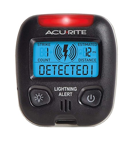 -. Brand : AcuRite -. Color : Black -. Feature : AcuRite Lightning Tracker / Strike alert with flashing red LED light and loud alarm / Displays estimated strike distance and current strike count / Shows speed of approaching storms up to 25 miles away / Works both indoors and outdoors -. Label : AcuRite® -. Manufacturer : AcuRite® -. ProductGroup : Lawn & Patio -. ProductTypeName : OUTDOOR_LIVING -. Publisher : AcuRite® -. Size : 2½L x 1W x 2¾H -. Studio : AcuRite® -. Title : AcuRite Lightning Detector