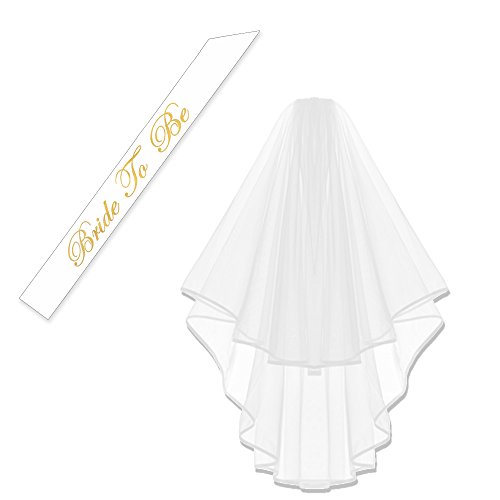 This pack includes - 1 x white double ribbon edge center cascade bridal wedding veil with comb(29" double veil with 2 inch clip). 1 x gold stamp bride to be letters satin sash(size:156cm / 61. 4"×9. 5cm / 3. 7").