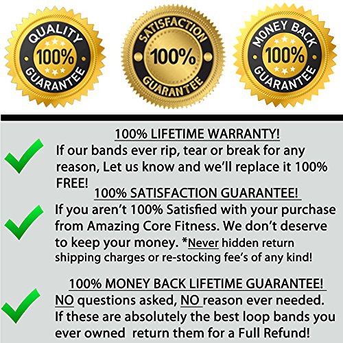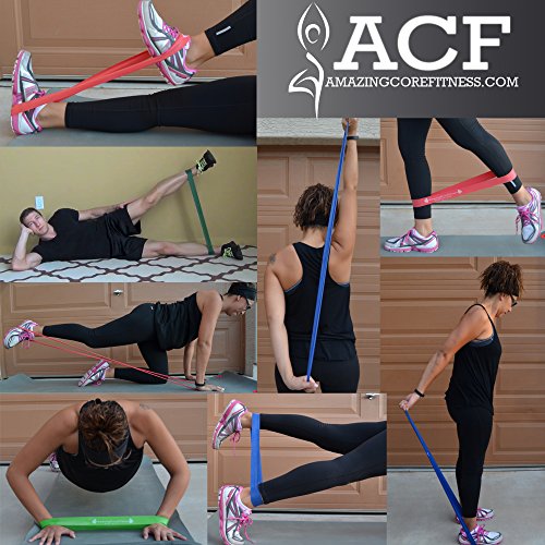 - Feature : ✔ SAVE 70% OFF TODAY - WHILE SUPPLIES LAST! Amazing Core Fitness Premium 12"x3" Resistance Loop Band set includes: Blue: 7.5 lbs., Red: 15 lbs., Green: 30 lbs., Black: 45 lbs. For Maxium Results with the least amount of effort ✔ Also Included: Our Exercise Training Guide eBook And Our Online Exercise Videos That Are Updated Monthly So You Will Be Always Up-To-Date With Your Workouts! / ✔ USED BY TRAINERS and PHYSICAL THERAPISTS: Any Band can be used together at one-time to create multiple levels of resistance. (5-97lbs) GREAT for P90x, Insanity, Cross Training, Yoga, Pilates, Beachbody, Physical Therapy, Strengthing, Upper Body or Any Workout out there. Also can be used for strengthening of glutes, legs, hips & knees. Recovery after Torn MCL, Torn ACL, Knee replacement, Isometrics / stabilization exercises, Monster walks, lateral walks, goblet squats, Improving mobility & Meniscus / Patella rehab. / ✔ 4 DIFFERENT RESISTANCE LEVELS: Four (4) Easy to use color-coded bands makes it an Essentail Addition to your Home Exercise Equipment. Time For a Healthier and Stronger You! Don't Wait... Get Your Amazing Core Fitness Loop Band Set Today! / ✔ EASY RESISTANCE ADJUSTMENTS: Includes: 4 Loop Exercise Bands Allowing you to quickly tailor your workouts achieving your desired results sooner. Professional grade durability and Elasticity -#1 on the market. / ✔ LIFETIME FREE REPLACEMENT, NO QUESTIONS ASKED, 100% MONEY BACK GUARANTEE: All Amazing Core Fitness Products Come with a built to last 100% LIFETIME GUARANTEE! No Questions to asked, 100% Money Back Guarantee When You Purchase Today!