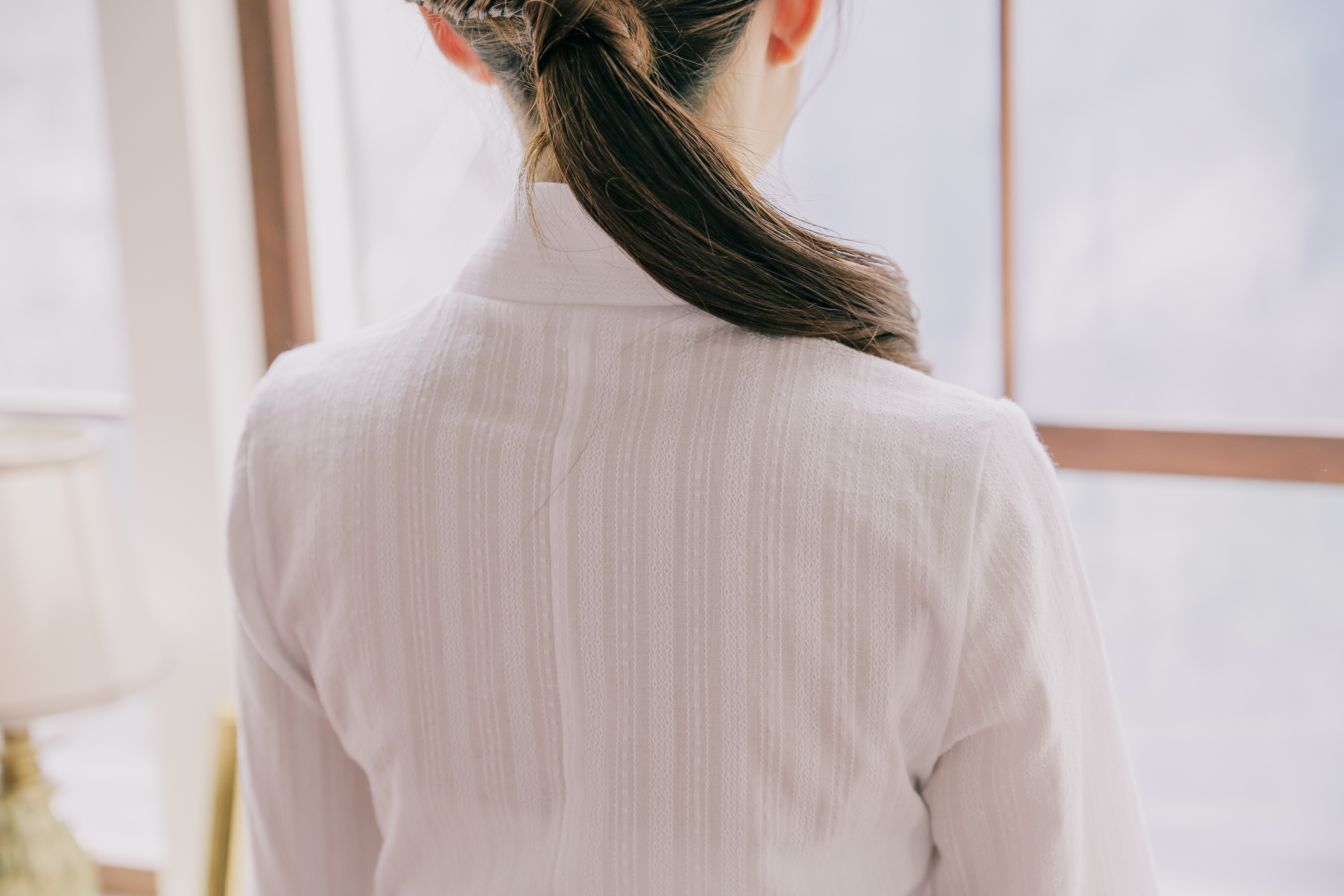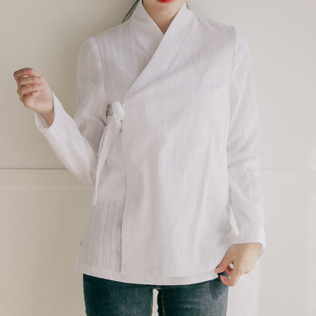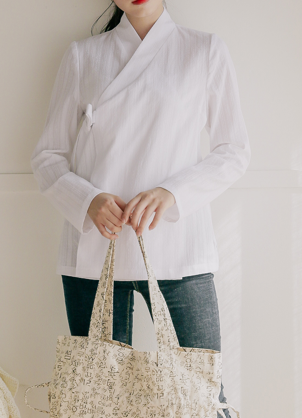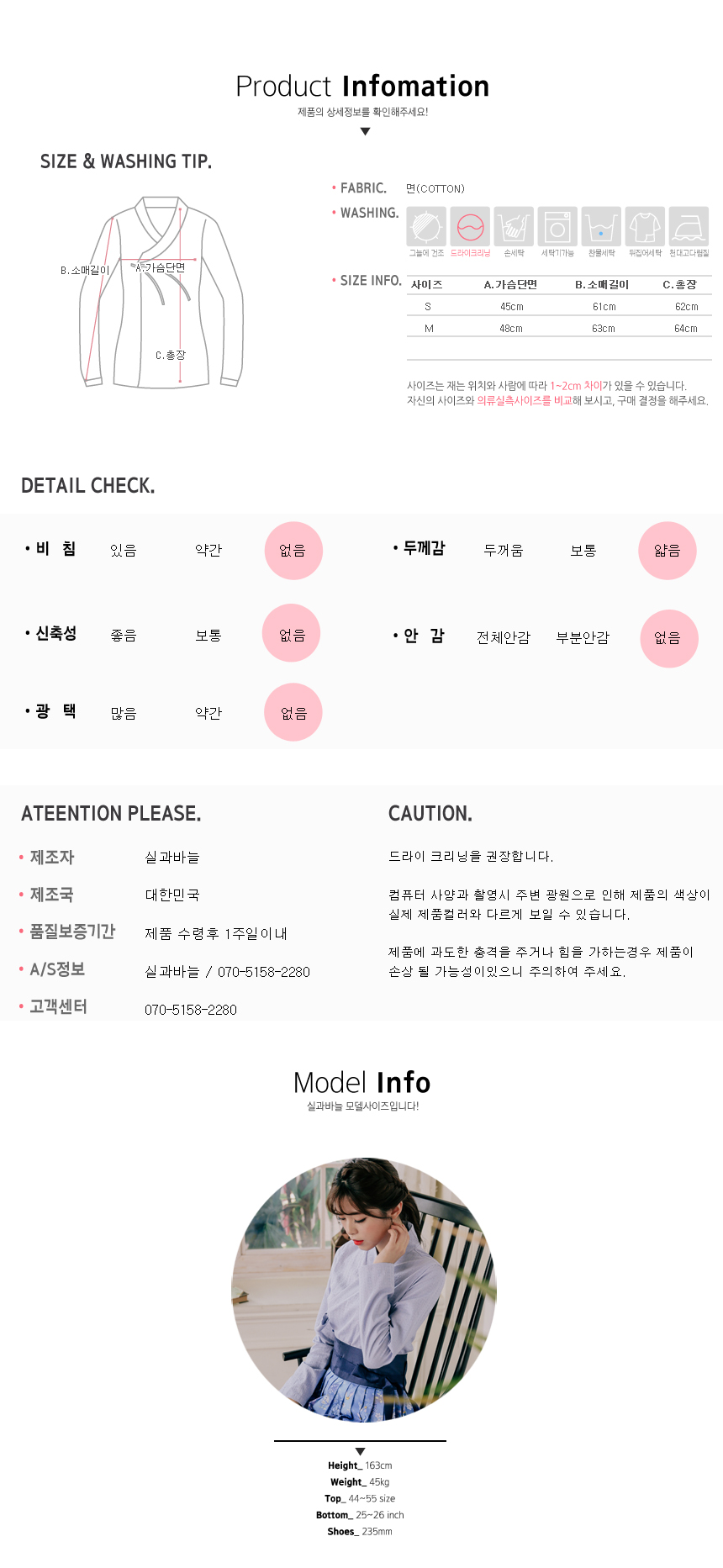 세로 쟈가드문양이 새겨져 있어 체형이 슬림해 보이고, 쟈가드 원단이 주는 톡톡함과 컬러가 주는 단아함은 어느 하의에나 잘 어울려 활용도가 아주 좋은 블라우스 저고리에요.