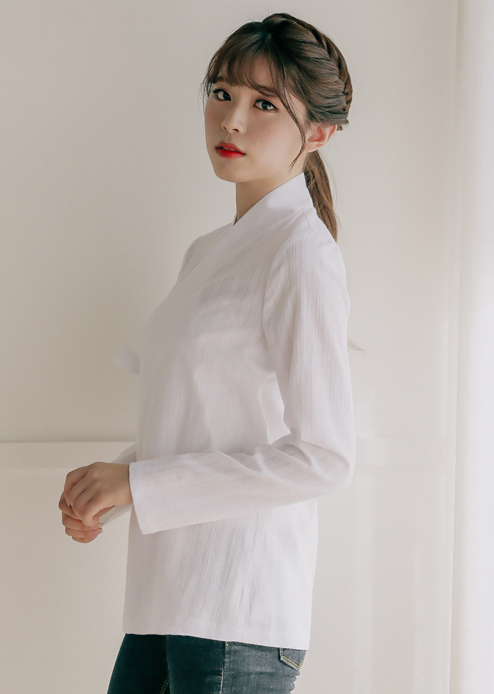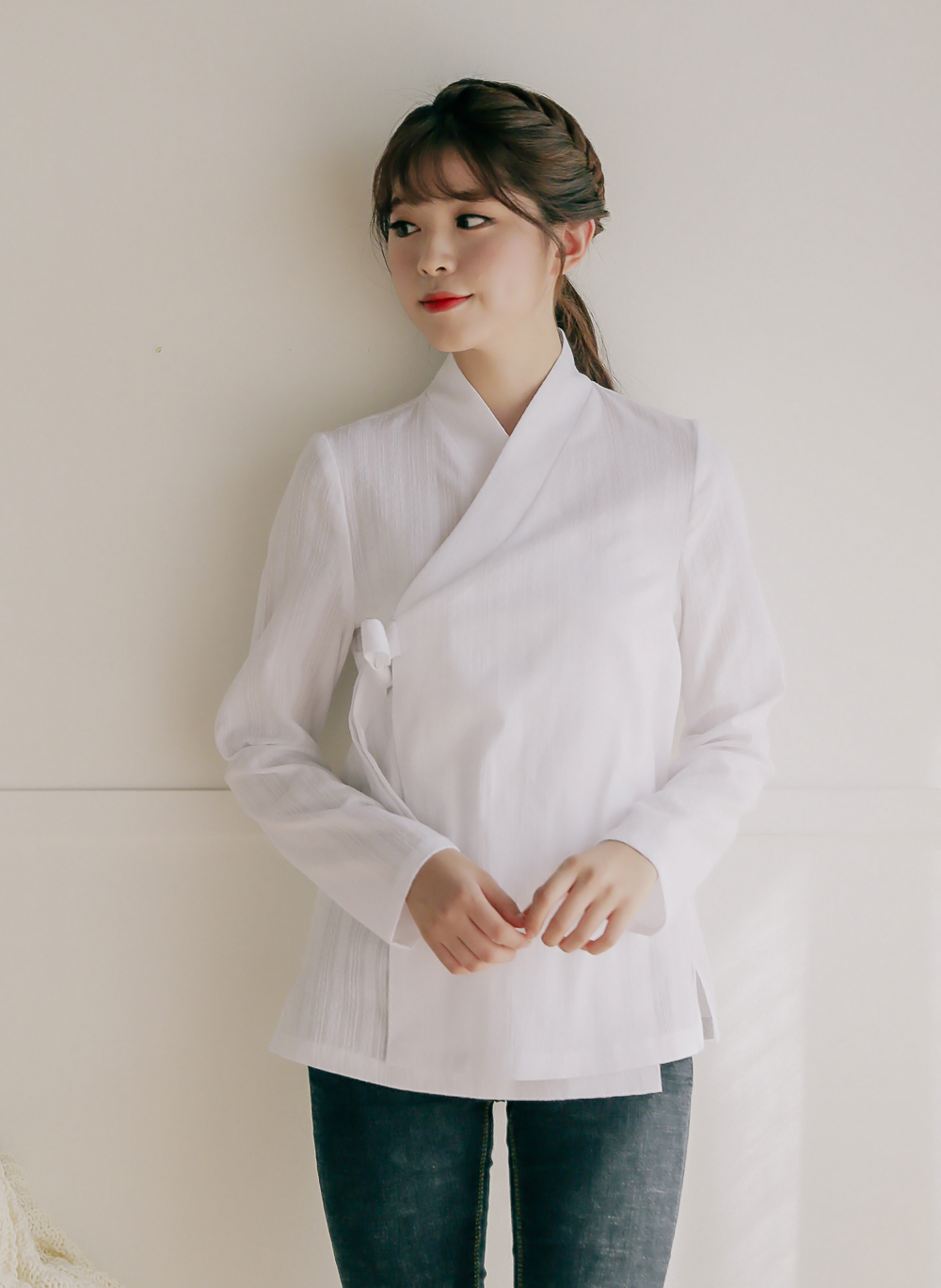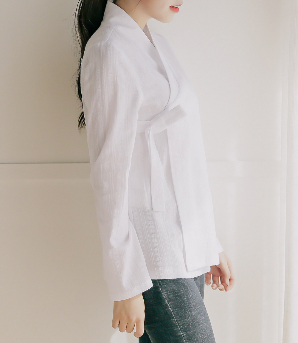 세로 쟈가드문양이 새겨져 있어 체형이 슬림해 보이고, 쟈가드 원단이 주는 톡톡함과 컬러가 주는 단아함은 어느 하의에나 잘 어울려 활용도가 아주 좋은 블라우스 저고리에요.