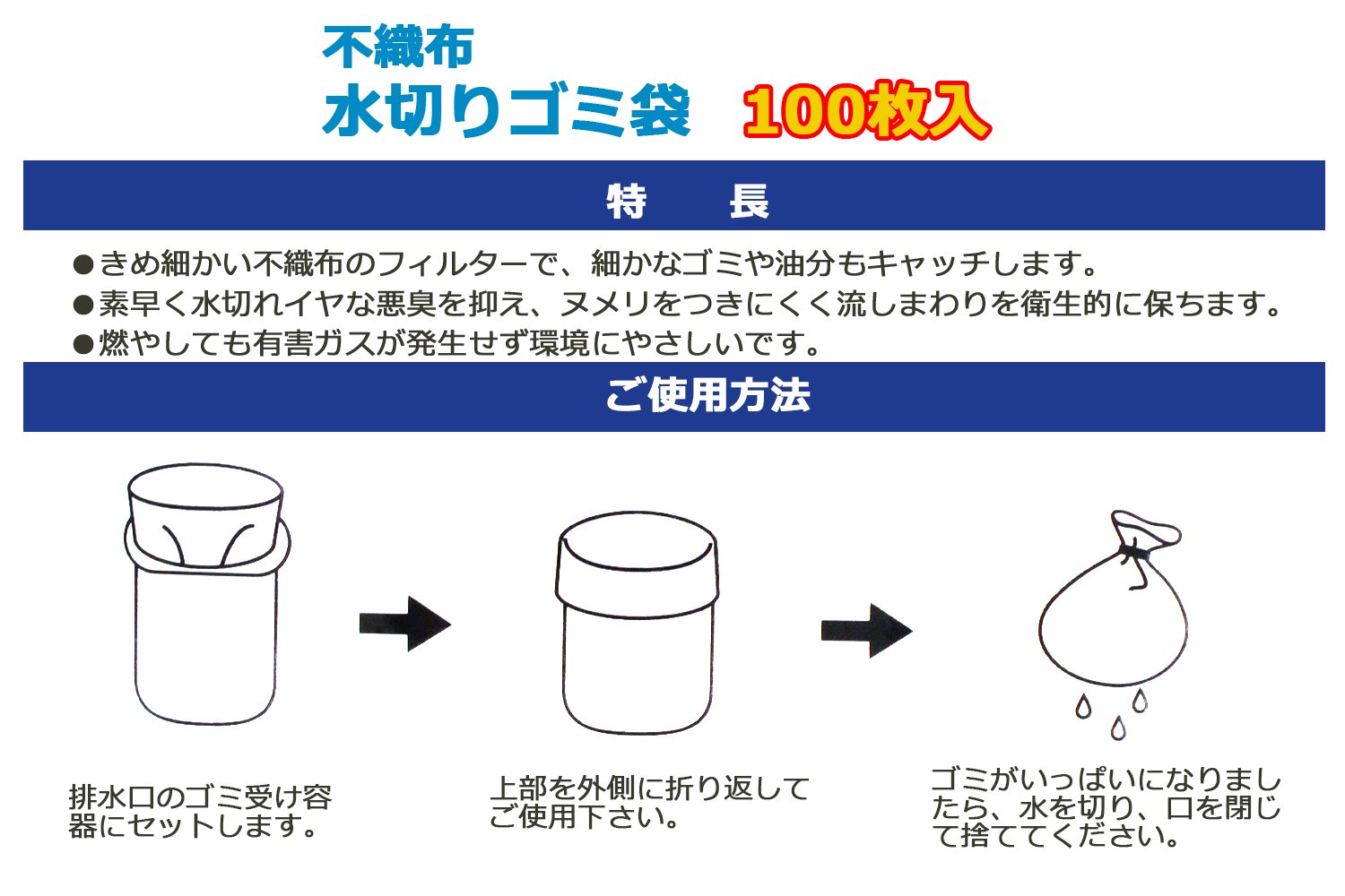 ● How to use, set in the waste receiving container of the drainage outlet, fold the upper end to the outside to use