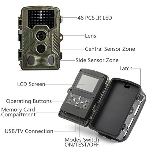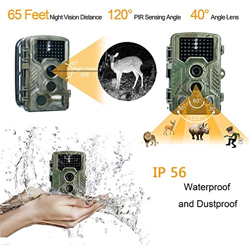 【Perfect Detection & Flash Range】This trail Camera is equipped with a 120° detection angle and a 65 feet detection range. The camera fits up with 46 black LEDs, it will not produce a bright flash in the darkness, which makes this outdoor wildlife camera a stealthy unit that does not intrude into the natural habitat.