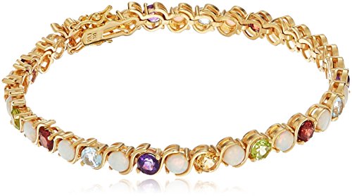 18k Yellow Gold Plated Sterling Silver Genuine Multi-Gemstones and Synthetic Reddish White Opal Bracelet, 7.25"