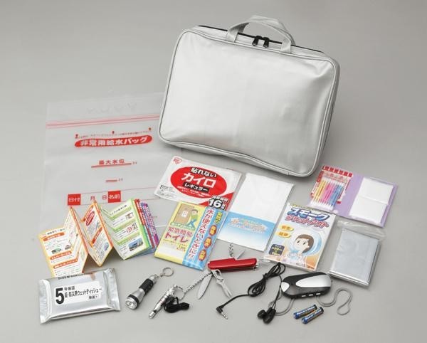 | セット内容 | バッグ(230×330×50mm)、非常用給水バッグ3L、LEDミニライト(ボタン電池LR41×4個入)、ホイッスル、防寒シート(210×130cm)、防災用ウェットティッシュ(20枚入)、カイロ、万能ナイフ、緊急簡易トイレ、救急セット(絆創膏M×3枚・S×2枚、カット綿2枚、プラ綿棒10本)、マスク、スモークシャットアウト、コンパクトFMラジオ、ラジオ用単4マンガン電池×2本、防災コンパクトガイド |