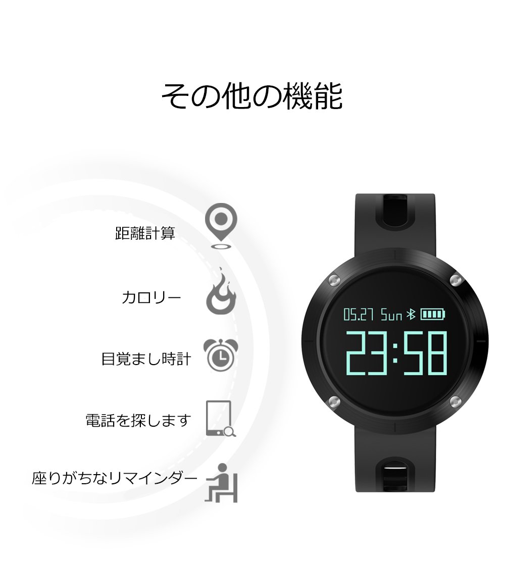 We have functions such as pedometer, heart rate monitor, wrist watch, blood pressure monitor, activity meter, Line notice, incoming notification, sleep meter, alarm clock, calorie expenditure, long-term care, alarm, time display, mobile search, exercise data analysis