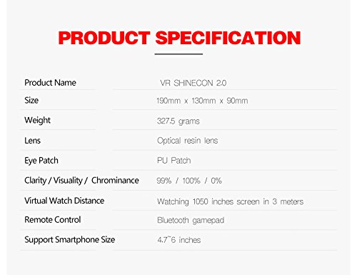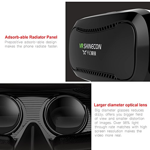 -. Binding : Electronics -. Brand : shinecon -. EAN : 0714449867857 -. Feature : Original authentic, latest VR Shinecon 2.0 3D Virtual Reality Glasses fit with iPhone&Android of 4.5-6.0 inches / No dizzy, feeling real, highly transparent lens by detial works brings the 720P display, with 19 pixel per degree in rehabilitation details, pupil distance adjustable, makes you fell like sitting in IMAX cinema / 96 degree field of view, avoids low pixel, bring you a wonderful view experience. / Easy installation, convenient pick up, adjustable VR headset, ergonomics design with comfortable wearing, / The front cover, adsorbed by magnet, is easy to be removed. It makes the phone cool while using, and it is great for ventilation for long use, solve the problem of heat dissipation. You can charge and use earphone at the same time through the ventilation holes on both sides. -. Label : Shinecon -. Manufacturer : Shinecon -. PackageQuantity : 1 -. ProductGroup : Speakers -. ProductTypeName : CE_ACCESSORY -. Publisher : Shinecon -. Studio : Shinecon -. Title : VR Shinecon 2.0 Upgraded 3D Virtual Reality Headset, Smart Phone 3D Movies Games Video Glasses, Compatible with iPhone and Android Smartphone 4.7"-6.0" -. UPC : 714449867857