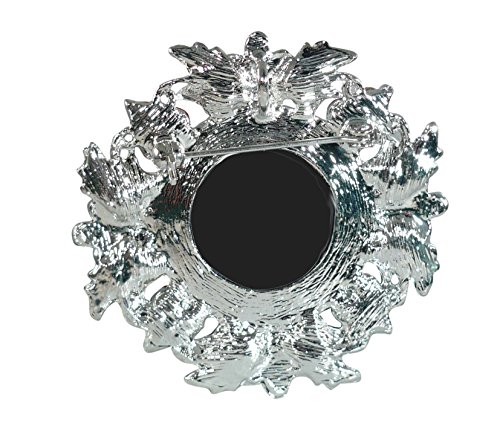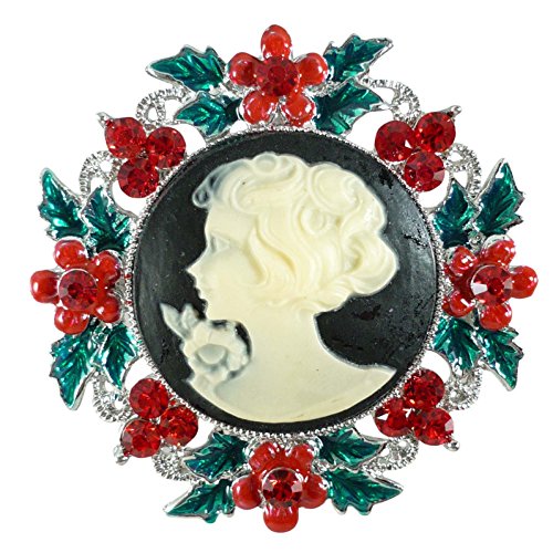 Memories of yesteryear and the romance of Christmas are calling you. Take this antiqued rhinestone simulated resin cameo pin. Silvertone base metal with tiny enamel flowers and rhinestones. About 2 inches long overall. About 2 inches wide. Pin back with safety C clasp. Not for children under 14. Made in China.Feature