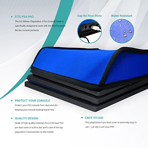 -. Binding : Video Game -. Brand : Lvl99Gear -. EAN : 0649558962202 -. Feature : FITS PS4 PRO: The LVL99Gear Playstation 4 Pro Console Cover is specifically designed to work with the PS4 Pro and it fits the console perfectly. / PROTECT YOUR CONSOLE: Protect your PS4 console from dust and dirt - keeping your console looking brand new. / QUALITY DESIGN: Made of high-quality material, the Lvl 99 Gear PS4 pro dust cover is built to last and is one of the top playstation 4 accessories on the market. / EASY TO USE: This playstation 4 pro dust cover is extremely easy to use - just slip it over your PS4. -. HardwarePlatform : PlayStation 4 Pro -. Label : LVL99Gear -. Manufacturer : LVL99Gear -. PackageQuantity : 1 -. ProductGroup : Video Games -. ProductTypeName : VIDEO_GAME_ACCESSORIES -. Publisher : LVL99Gear -. Studio : LVL99Gear -. Title : PS4 Pro Blue Dust Cover - Playstation 4 Pro Console Dust Cover - Premium PS4 Accessories -. UPC : 649558962202