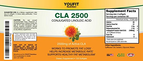 -. Binding : Health and Beauty -. Brand : YouFit Nutrition -. EAN : 0641361997341 -. Feature : CLA 2500 by Youfit Nutrition is 2500mg per serving • MEN or WOMEN use CLA • Reduce body fat without losing lean muscle mass • Use CLA and exercise for weight management and Toning • Made in the USA -. IsAdultProduct : 0 -. Label : Youfit Nutrition -. Manufacturer : Youfit Nutrition -. MPN : cla2500120 -. PackageQuantity : 1 -. PartNumber : cla2500120 -. ProductGroup : Health and Beauty -. ProductTypeName : HEALTH_PERSONAL_CARE -. Publisher : Youfit Nutrition -. Studio : Youfit Nutrition -. Title : YOUFIT Nutrition CLA 2500, Conjugated Linoleic Acid, Weight Loss Supplement for Women and Men, 2500mg per serving 120 soft gels -. UPC : 641361997341