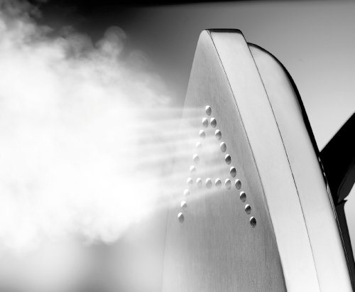 Sanft gleitende PRO-Aluminiumsohle mit konzentrierten Dampfdusen. Dampfschalter befindet sich in zentraler Position. Transportgriff. Automatische Abschaltfunktion bei Nichtgebrauch. No-Calc System:einfachstes Entkalken, Sauberkeit.