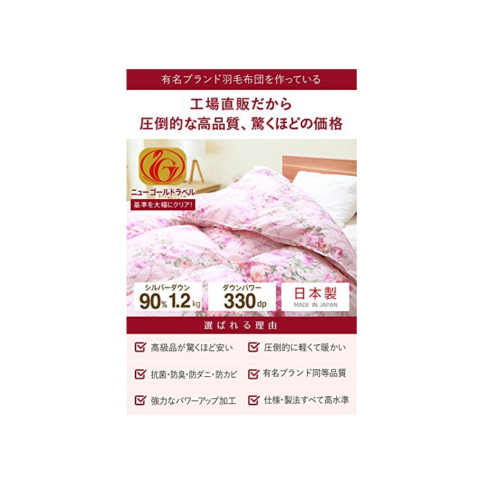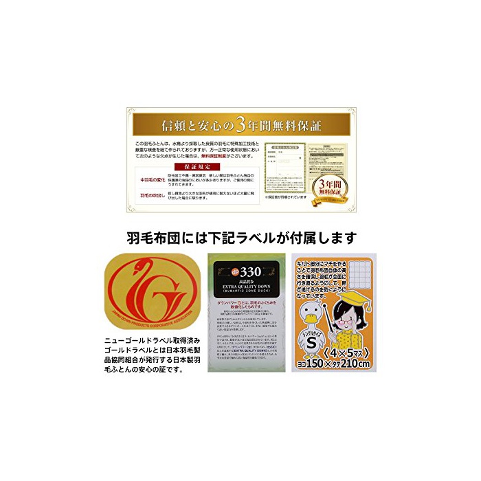 [일본 깃털 제품 협동조합(일(날) 마리협)](경제 산업성의 인가를 취득한 단체입니다)의 인정을 받은 고품질3개성★★★의 뉴 골드 라벨의 깃털 이불 입니다.뉴 골드의 인정 기준은[다운 파워300dp]의 깃털이지만,이쪽의 상품은,그것을 크게 클리어했습니다 320dp의 톱 랭크의 깃털을 사용 하고 있습니다.「일본 섬유 제품 품질 기술 센터」(Q-TEC)에서의 인정을 받은 깃털 입니다.『Q?TEC』란 깃털 제품의 품질 성능 평가 시험을 해 국제적에 대응한 성적 증명서의 발행을 하는 기관 입니다.또한『일(날) 마리협』란 깃털의 품질 검사 방법의 JIS규격을 제창한 단체이기도 하고, 깃털 제품이 정확한 품질 표시나 산지 등을 엄격하게 관리 하고 있는 단체 입니다.이와 같은 엄격한 관리가 행해진 안심 깃털을 사용 하고 있습니다.부디 안심하고 쾌적하게 사용 하실 수 있는 깃털 이부자리 입니다.