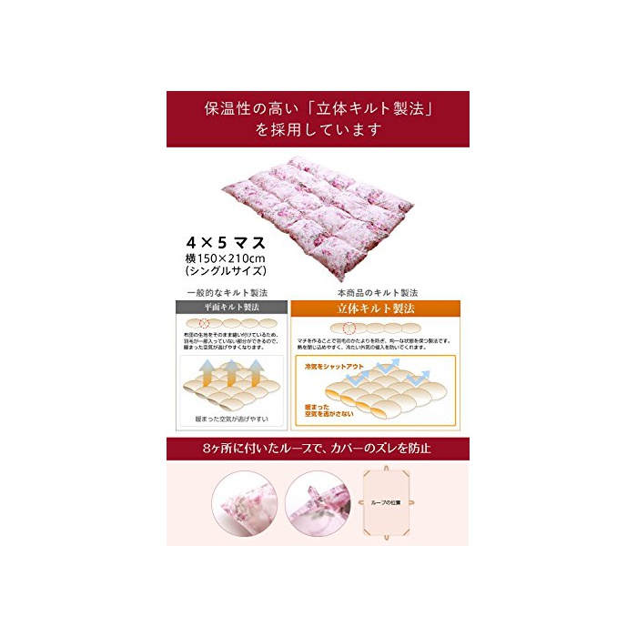 싱글 사이즈 150x210cm 4×5마스 1 층입체 퀼트.《무라》없어 전체적으로 균일한 따뜻함을 유지하고, 몸에 피트 하기 쉬운 퀼트입니다.