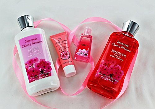- Body Lotion: Japanese Cherry Blossom body lotion infused with Vitamin E, Aloe, and skin-softening Shea Butter, this formula soften dry rough skin and delivers long-lasting moisturizing.