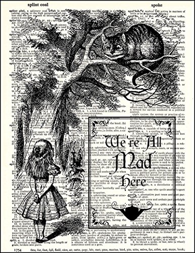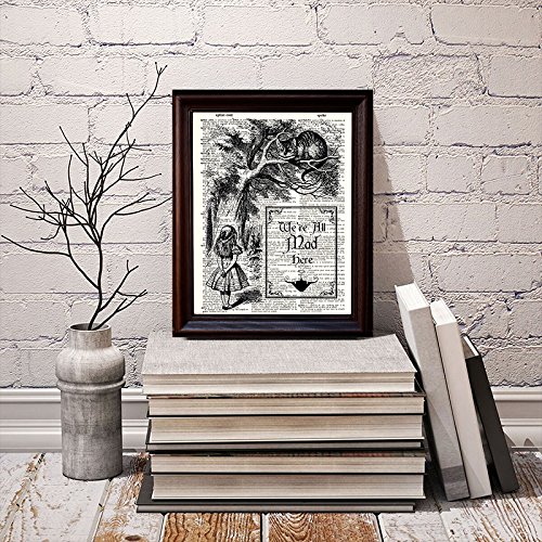 This Alice in Wonderland design "We're all mad here" shows Alice and the Cheshire Cat. It is printed on beautiful vintage dictionary paper. These prints are definitely a conversation starter and look fabulous as a wall hanging. Each design is carefully selected and then printed on vintage dictionary paper giving it that beautiful golden color that only comes from age. Since we use real book pages some unevenness or spotting occurs, this only adds another layer to the print, making each one truly unique. Dimensions are approximately 8" W x 10.5" L. *** Frames are not included.***Feature