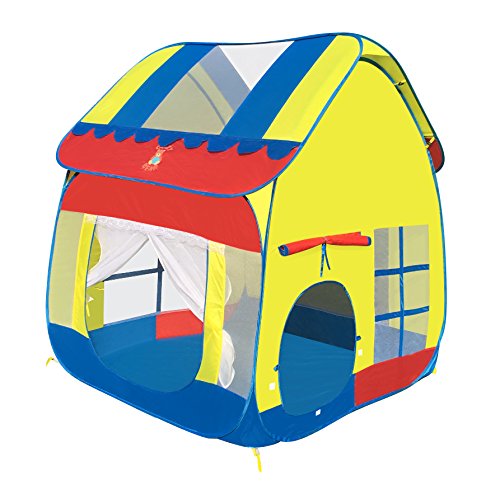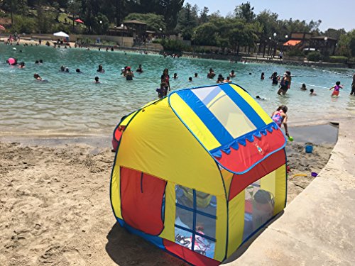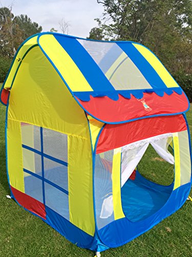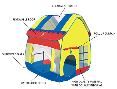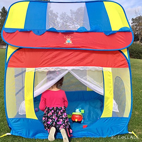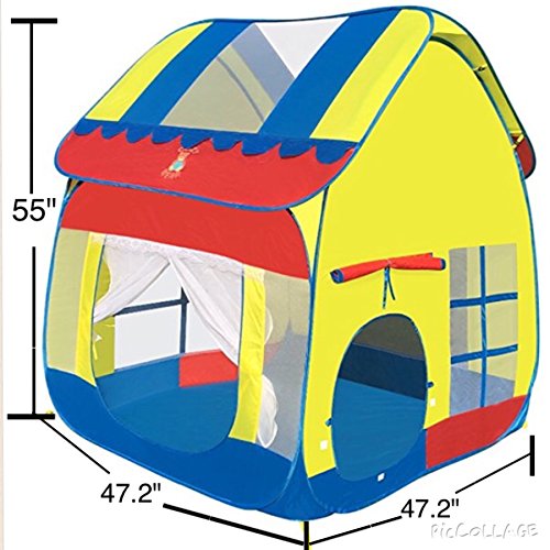 Colorful Big Playhouse kids tent with removable roof. High Quality 100% polyester with double stitching. Easy to clean and has a waterproof floor. Beautiful pop up kids tent and easy to set up. Also comes with instructions on how to collapse and put it back into the storage bag. Great for kids birthday parties. Comes packed in a carry bag with the Cozy Bear logo on the front of the bag. Cozy bear logo is also on the roof of the tent. Size: 47.2" x 47.2" x 55" Capacity: 2-4 kids Package size: 19" x 19" x 1" Package Weight: 4 lbs. Notice: Keep away from fire. Made of high elastic steel wire, be careful of rebound when opening.Feature