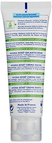Mustela's exceptionally rich Hydra Bébé Facial Cream penetrates effortlessly to deliver immediate and long-lasting moisture to your baby's sensitive face. Formulated with an elixir of plant-based ingredients including Jojoba Oil, Sunflower Oil, Vitamins E and F, Sweet Almond Oil, Shea Butter, and our signature Avocado Perseose, Hydra Bébé Facial Cream protects and strengthens the skin on your baby's face. Its non-greasy lotion formula leaves your baby's face silky-smooth and with a hint of Mustela's beloved and iconic fragrance on your baby's cheeks. Use in conjunction with Hydra Bébé Body Lotion for complete hydration and moisture. Composed of 86% natural ingredients. Paraben, Phthalate, and Phenoxyethanol free. Hypoallergenic, and specially formulated to minimize the risk of allergic reactions. Tested under dermatological and pediatric control. Travel-friendly.Feature