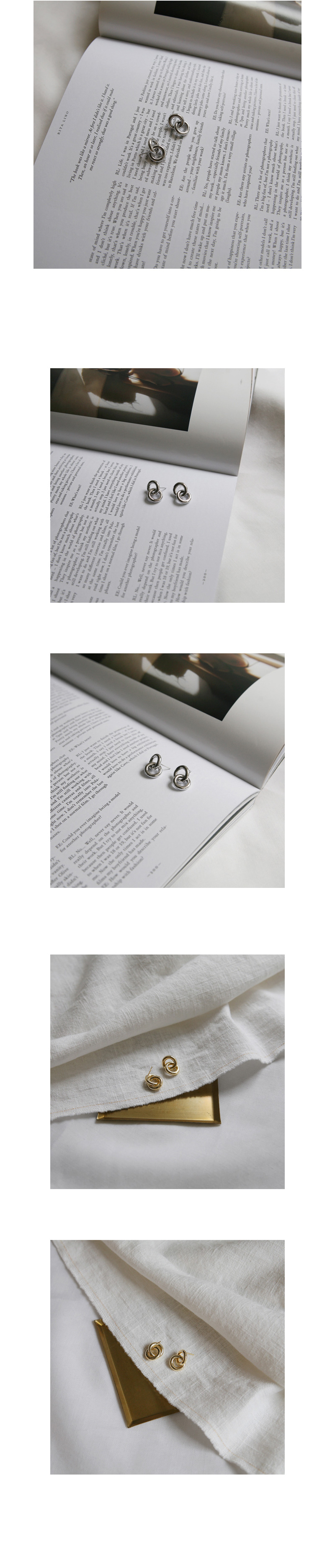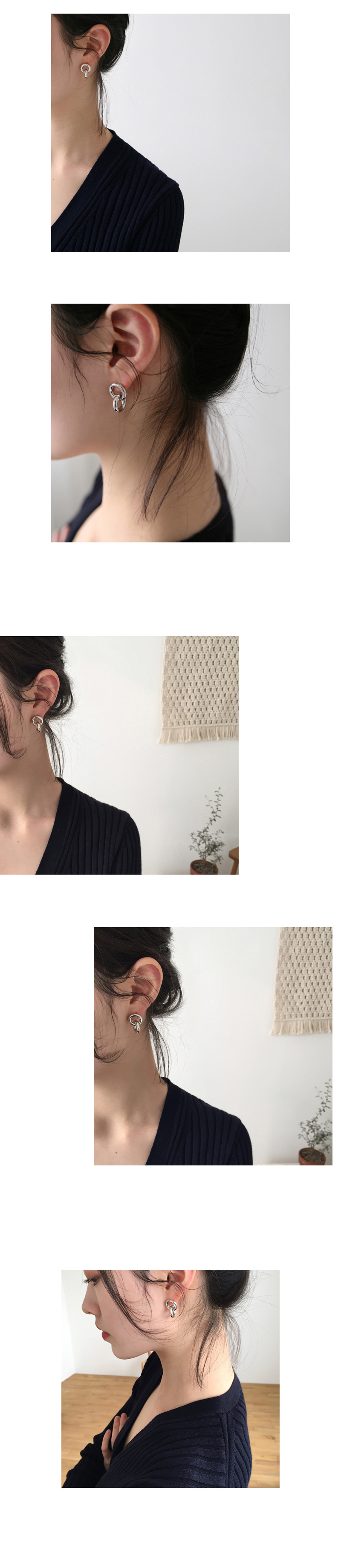 두께감이 있는 서클라인이 엮여있는 쉐입의 이어링입니다.