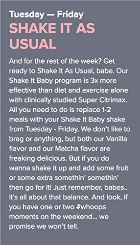 -. Binding : Health and Beauty -. Brand : Flat Tummy Tea -. EAN : 0855119006258 -. Feature : MOVE THOSE STUBBORN LBS - With clinically studied Super Citrimax, our Shake It Baby program is 3 x more effective than diet and exercise alone. / PACKED WITH - 20 grams of plant based protein, 22 vitamins and minerals, 50 fruits and vegetables and Super Citrimax / CONTROL YOUR APPETITE - Shake It Baby is gluten free, dairy free and 100% vegan, they're also soy free and contain no added sugar. / KICK THOSE CRAVINGS - Need to add a bit of self control? Yep, we're going to help you get to where you wanna be! / SHAKES MONDAY - FRIDAY - The Extra Kick Monday shakes are specifically designed to kickstart your week and the rest you just shake it as usual! -. IsAdultProduct : 0 -. Label : Synergy CHC Corp (HPC) -. Manufacturer : Synergy CHC Corp (HPC) -. NumberOfItems : 1 -. PackageQuantity : 1 -. ProductGroup : Health and Beauty -. ProductTypeName : HEALTH_PERSONAL_CARE -. PublicationDate : 2017-12-17 -. Publisher : Synergy CHC Corp (HPC) -. ReleaseDate : 2017-12-17 -. Studio : Synergy CHC Corp (HPC) -. Title : Flat Tummy Tea Shake It Baby Vanilla Pod, 20 Pack Meal Replacement -. UPC : 855119006258