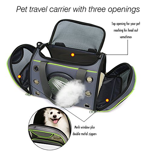 Product feature *The size of our pet carrier complies to the carry-on bag size regulations of most airlines so you can take the carrier to the plane. *Oxford cloth and mesh material is wearable enough to hold up to continuous digging and chewing by your active pet. *The mesh window provides superior airflow plus visibility so your pet can breath fresh air and will never feel claustrophobic. *Three openings are designed for you to get your pet into the carrier much easier than try to get him into a single opening. And double metal zippers provide you convenience to open and close the carrier as well as prevent his escape. *Removable fleece pad with a sturdy base board in it will provide your pet with a solid,flat and snug accommodation.