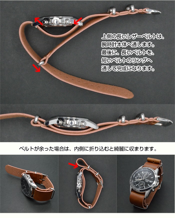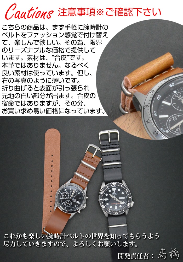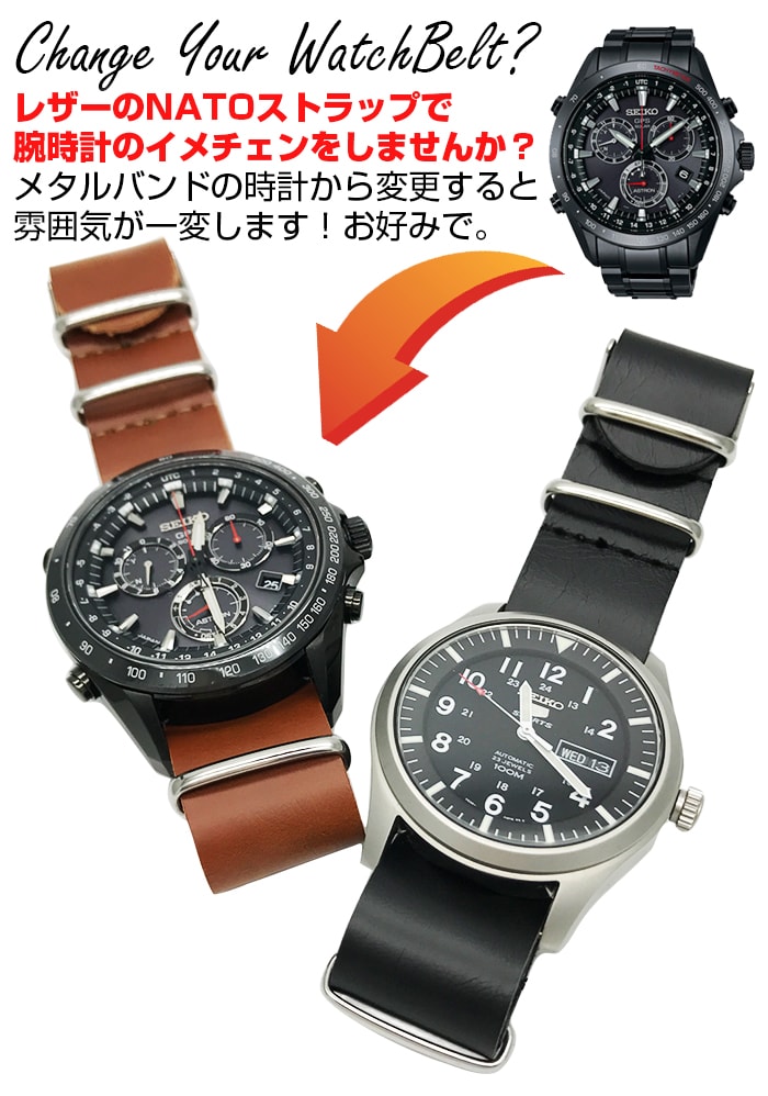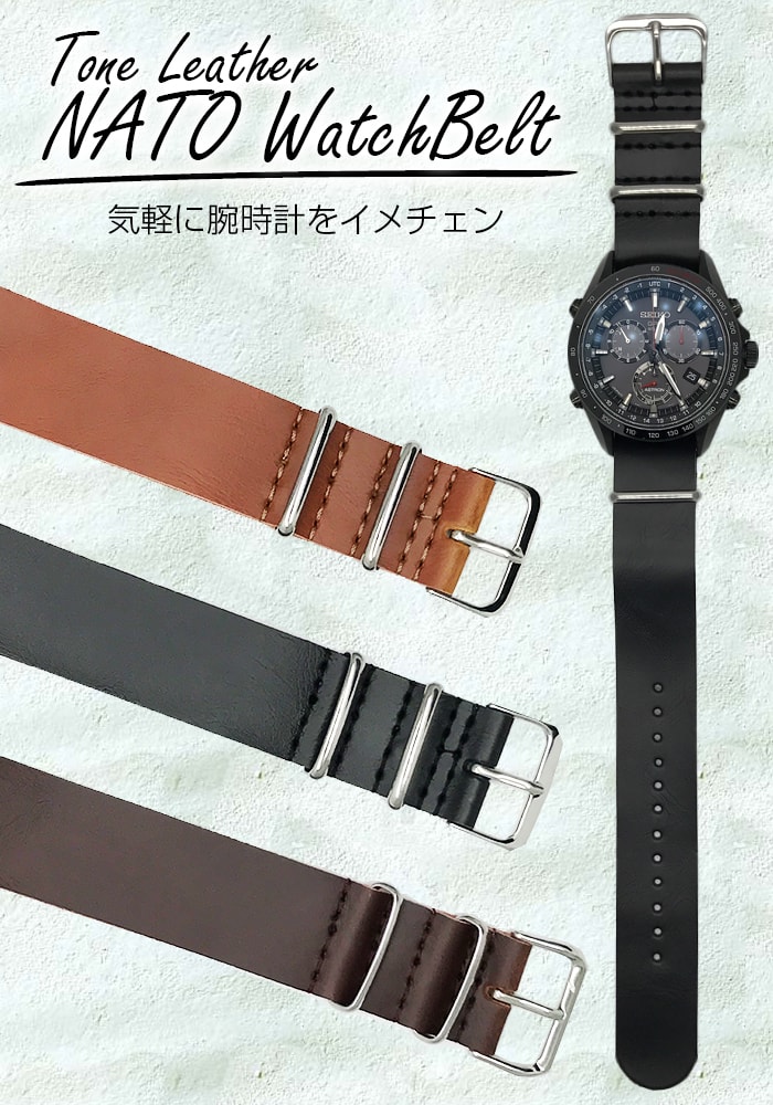 ■ 商品説明 : 人気の NATOベルト の レザー タイプ です。こちらの商品は 合皮 タイプとなっておりますので、ご注意下さい。その分、 リーズナブル な モデル となっております。また、非常に 合皮 の特徴でもありますが、 柔らかい さわり心地 です。 NATOベルト は、一度装着すると、 NATOベルト から NATOベルト への 交換 が非常に楽なので ファッション に合わせて付け替えなど、楽しめますのでおすすめです。