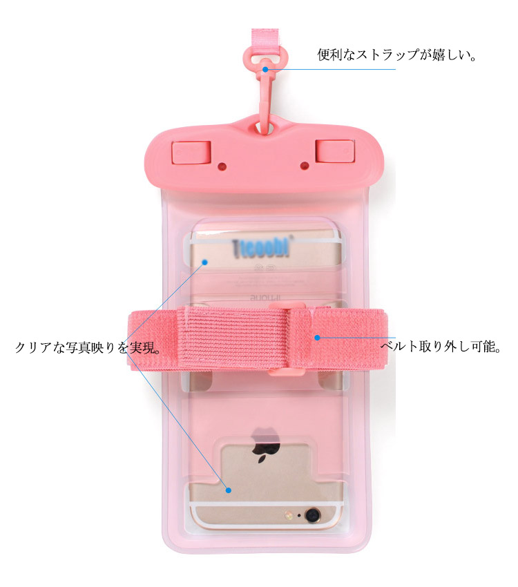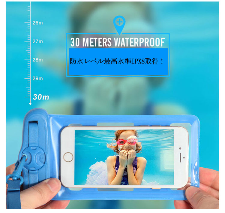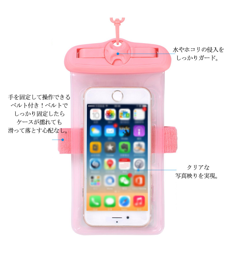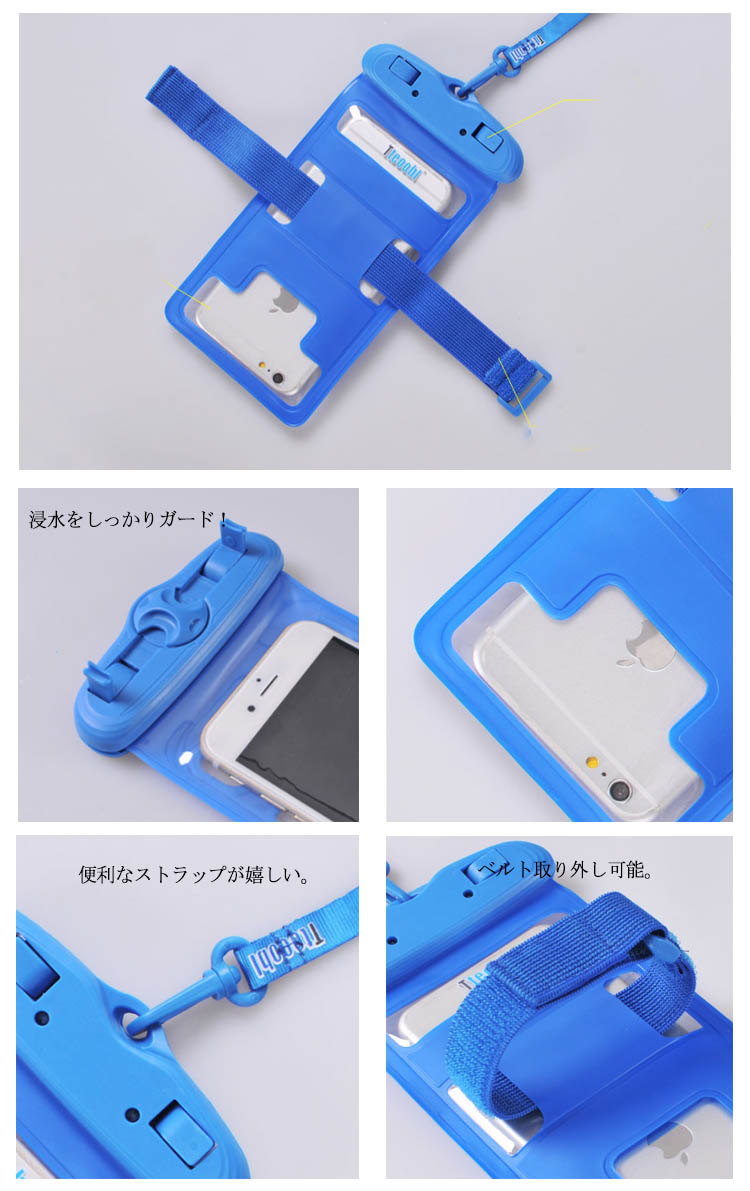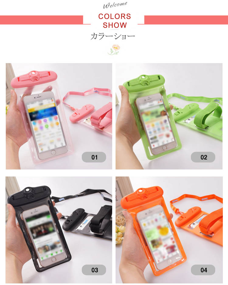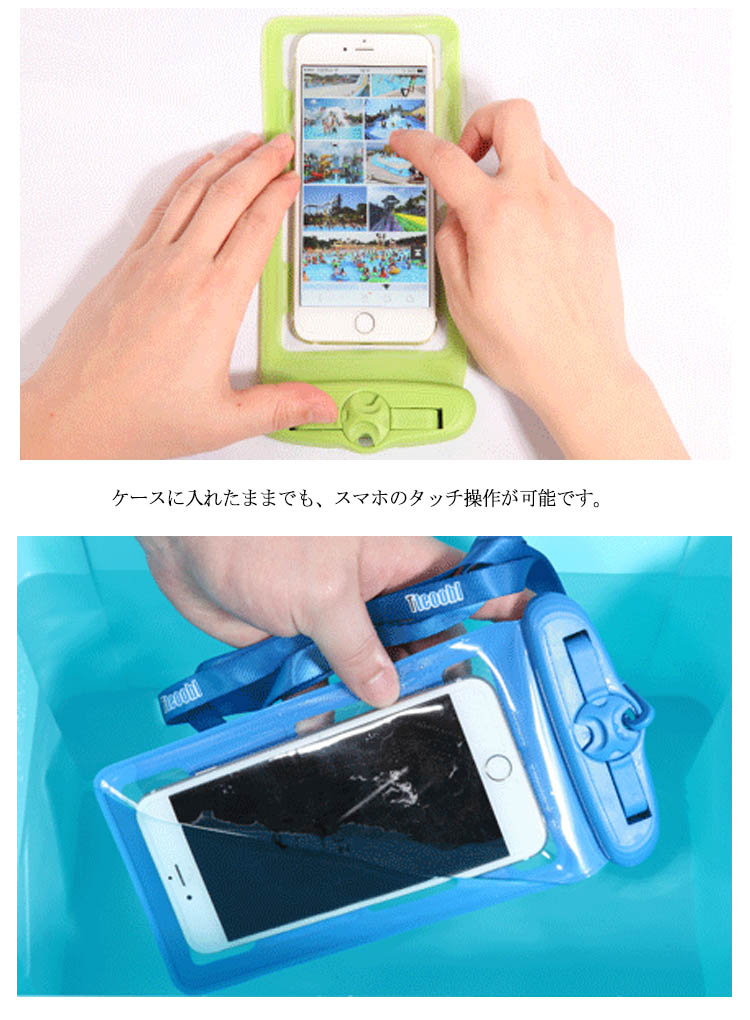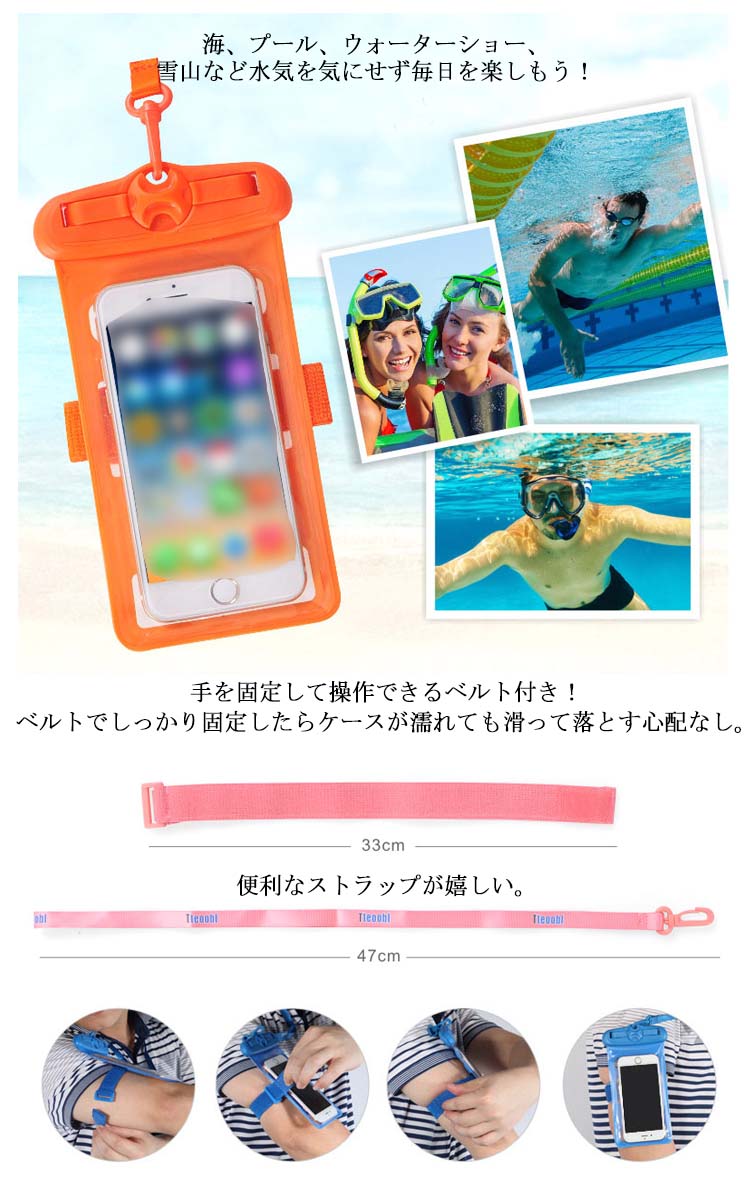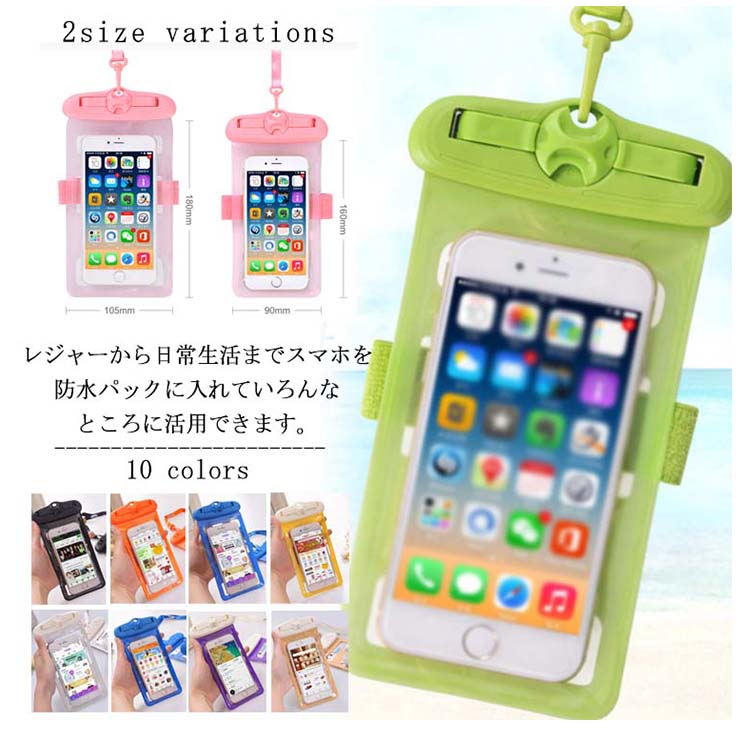 | レジャーから日常生活までスマホを防水パックに入れていろんなところに活用できます。防水ケースに入れたまま、スマホの操作が可能です。 また全面クリアなので、防水ケースに入れたまま、写真・動画撮影が可能です。海、プール、ウォーターショー、雪山など水気を気にせず毎日を楽しもう! | |