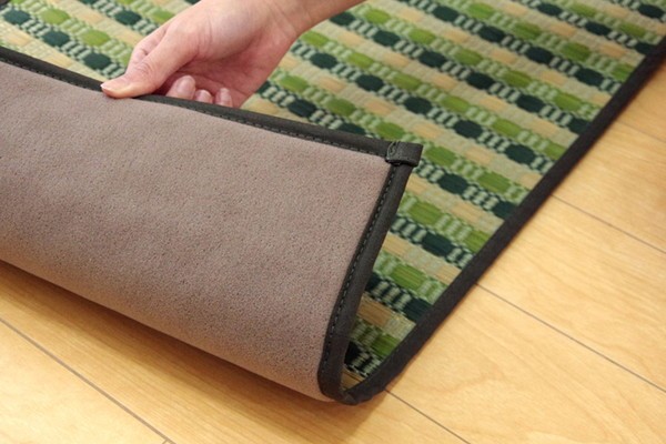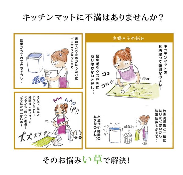 い草のキッチンマットです。キッチンマットの不満を解消してくれる商品です。化繊もののキッチンマットと比べ、汚れにくくシミになりにくいです。小さなゴミでも、ほうきで掃く、掃除機をかけるだけで取り除くことができます。い草自体が持つ油分により汚れを弾くので洗う必要がなく長くご使用いただけます。裏地にはウレタンフォームを使用しクッション性を持たせています。