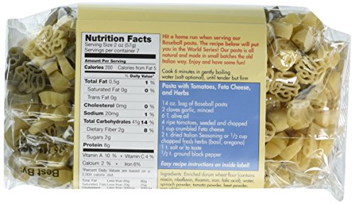 -. Binding : Misc. -. Brand : The Pasta Shoppe -. EAN : 0608819911472 -. Feature : Each package has a combination of unique pasta shapes - Baseball bat, Gloves and Balls / Two natural colors made with all natural vegetable powders / 2 - 14 ounce packages. 6-8 Servings per package / Tomato and Feta Pasta Recipe included on back of package / Contains Wheat and Egg -. Label : Unknown -. Manufacturer : Unknown -. MPN : 7007809 -. PackageQuantity : 2 -. PartNumber : 7007809 -. ProductGroup : Grocery -. ProductTypeName : GROCERY -. Publisher : Unknown -. Studio : Unknown -. Title : Baseball Pasta Baseball Bats, Glove and Ball Shapes - 2 Pack -. UPC : 608819911472