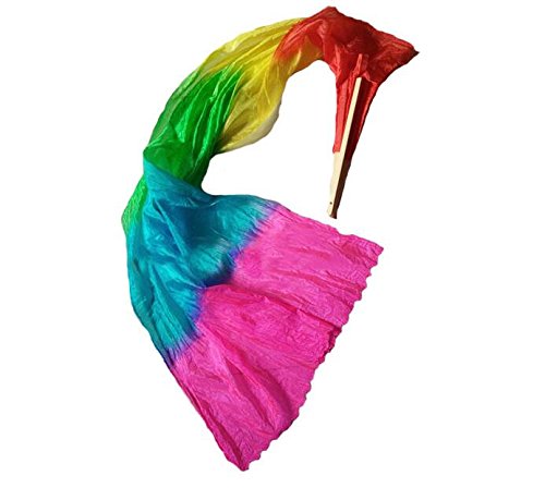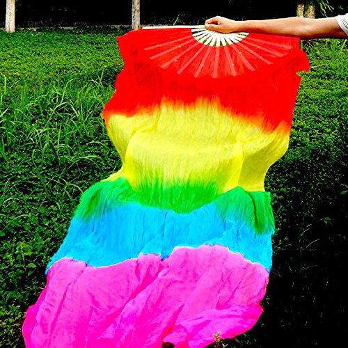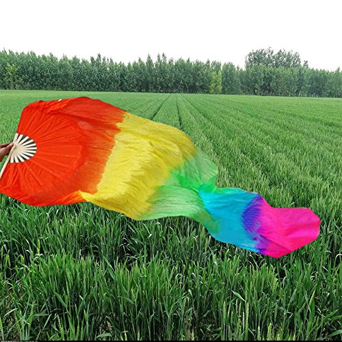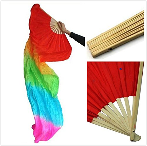 Belly Dance Fan Hand Made Long Veil Silk Bamboo Chinese Dancing Fan for Party Stage Performance Gradient Flame Rainbow Color 1 Pack 1.8m/5.9FT