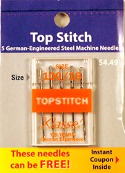 -. Binding : Kitchen -. Brand : Klasse -. Feature : 5 German-Engineered Steel Machine Needles The extra large eye is made to accomodate a thicker topstitching thread. The extra sharp point is specially designed to allow the needle to penetrate easily through all fabrics. With a unique curved design at the clearance-above-the-eye "CAE" stress point distributes pressure equally which makes Klasse needles much stronger then other flat conventional needles -. PackageQuantity : 1 -. ProductGroup : Home -. ProductTypeName : HOME -. Title : Klasse' Top Stitch Needles Size 100/16