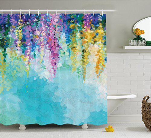 Watercolor Flower Home Decor Shower Curtain by Ambesonne, Ivy Romantic and Inspiring Landscape Spring Floral Art Nature Theme, Fabric Bathroom Decor Set with Hooks, 84 Inches Extra Long, Multi