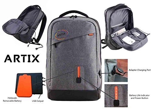 -. Binding : Electronics -. Brand : Artix -. Color : Grey -. EAN : 0700600920967 -. Feature : Rechargeable 7000MAH Removable Battery: Never let your devices run out of juice while you're on the go with this convenient travelling backpack with built in battery system. The backpack comes equipped with multiple USB 2.0 charging ports to easily plug in most Micro-USB or Apple products. No need to hug the wall charger or fumble around inside your bag to find your power pack. Simply plug your Smartphone, tablet, eReaders and more in right from the outside and keep moving / One Touch Power Button and Power Level Indicator: Easily turn on the internal power bank using the button conveniently located on the front of the pack. An LED light indicates battery level. Power backpack automatically powers off when not connected to a device. / Water Resistant Durable Design: With its premium water resistant design, the Artix Power backpack ensures your devices' safety. Material wicks away water, so do not fret if you happen to get caught in a light rain shower. Your electronics are all safely housed. / Multiple Device Charging Function: Built in 7000MAH lithium battery built in charging system and 3 included Female USB Port cables allow for simultaneous charging of multiple devices while on the move; power bank charging cable also included / 1 Year Hassle Free Limited Warranty and USA Based Customer Service -. Label : Artix -. Manufacturer : Artix -. Model : LYSB01N0LTG1N-OFFSUPPLIES -. MPN : LYSB01N0LTG1N-OFFSUPPLIES -. PackageQuantity : 1 -. PartNumber : LYSB01N0LTG1N-OFFSUPPLIES -. ProductGroup : PC Accessory -. ProductTypeName : COMPUTER_COMPONENT -. Publisher : Artix -. Studio : Artix -. Title : Artix Power Bank Water Resistant Backpack For Laptops and Smart Devices 7000mAh | Lightweight | Multipurpose | Fits Laptops Up To 15.6" -. UPC : 700600920967