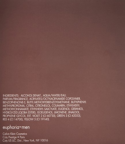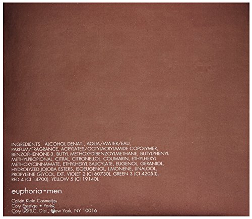 Studio : Calvin Klein ReleaseDate : 2007-04-02 Publisher : Calvin Klein Binding : Health and Beauty Product Description Addictive. Masculine. Sexy. euphoria men invites you to reach beyond your limits and experience your most intense desires. This fresh oriental fragrance blends crisp, modern freshness and aromatic spices with a sexy, creamy signature. Top Notes: ginger pepper cocktail, raindrop accord, chilled sudachi Middle Notes: black basil, sage and cedar leaf Base Notes: amber, patchouli, Brazilian redwood and creamy suede 0