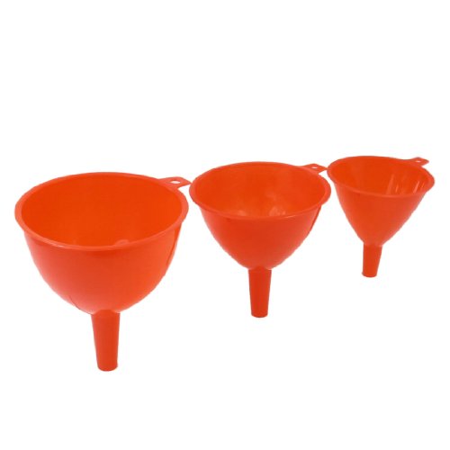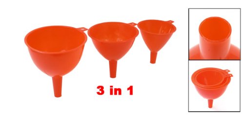-. Feature : Product Name : Funnel;Material : Plastic / Color : Red;Thickness : 0.1cm/ 0.039" / Biggest Size : 14 x 12.5 x 1.5cm / 5.5" x 4.9" x 0.6" (H*Outside D*Mouth D);Medium Size : 12 x 11 x 1.3cm / 4.7" x 4.3" x 0.5" (H*Outside D*Mouth D) / Smallest Size : 10 x 9.3 x 1.3cm / 3.9" x 3.7" x 0.5" (H*Outside D*Mouth D);Weight : 57g / Package : 3 in 1 x Plastic Funnel