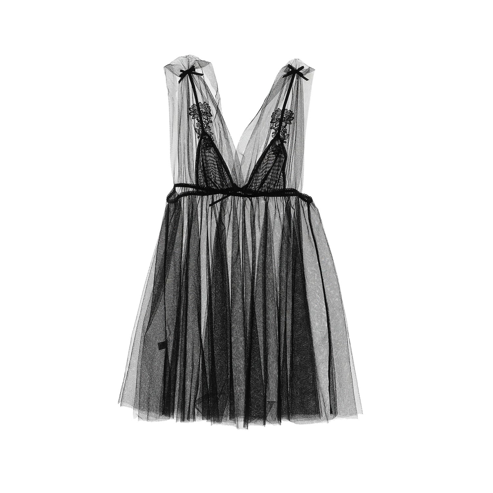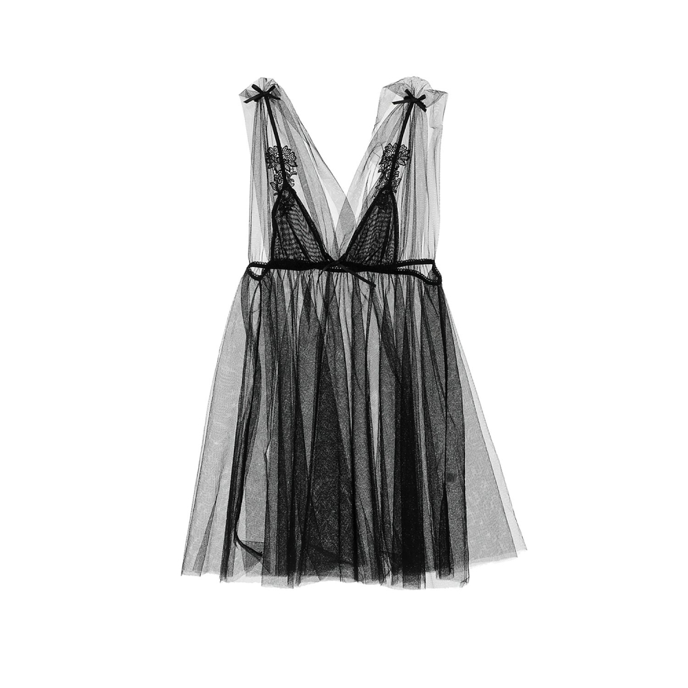 육각망 소재로 프릴양을 풍성하게 준 슬립. 블랙컬러감이 사계절 내내 잘 어울리며 고급스러운 자수매치가 유니크 하면서도 우아한 느낌. 양 어깨단에 리본으로 포인트를 주어 사랑스러움을 강조하고 시스루 원단이 섹시미까지 더해줌. 시스루한 소재의 슬립이기때문에 연동 브라 팬티와 함께 착용하는것도 추천!