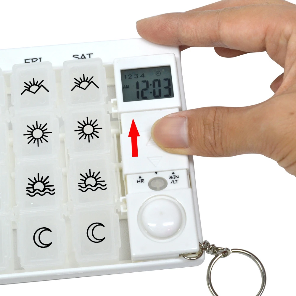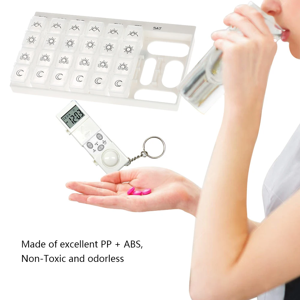 Carevas PFT-59 pill reminder help to remind you to take medicine on time and store pills, tablets in a clean and handy way. Settable 4 groups of timer, 28 grids design(7 day X 4 times/day), suitable for work and travel. Don't worry about forget to take medicine!