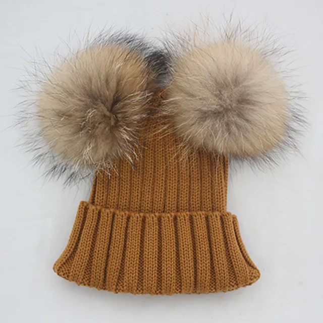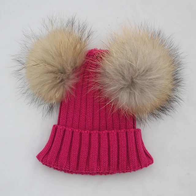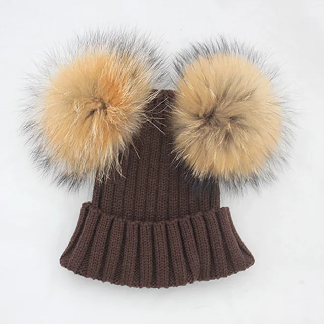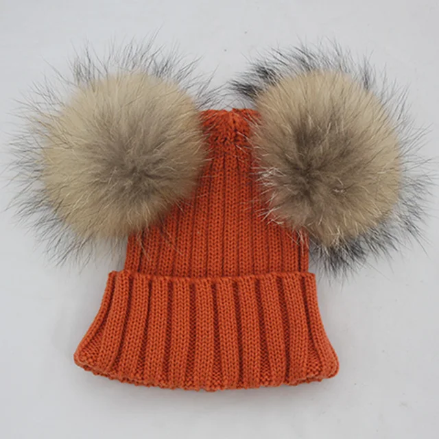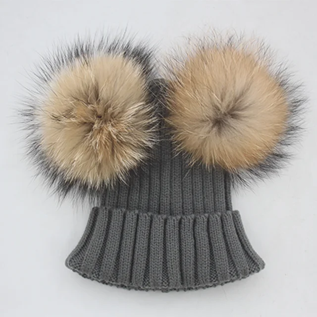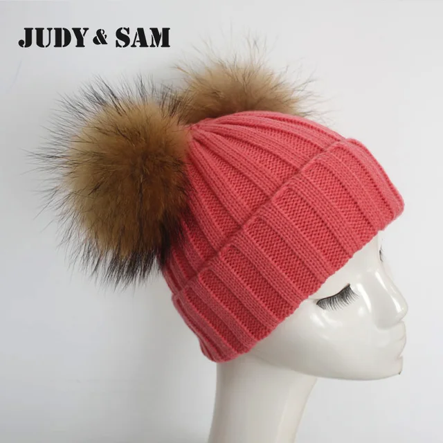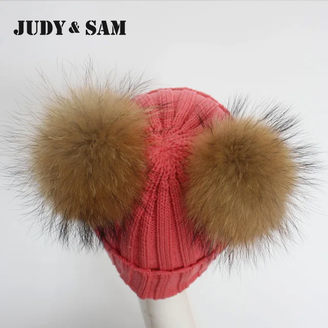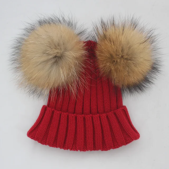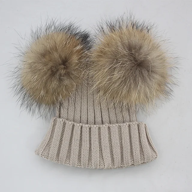 | [해외]더블 응원 여성 겨울 모자 혼방 모직 니트 gorros 캡 천연 컬러 너구리 모피 자란 |